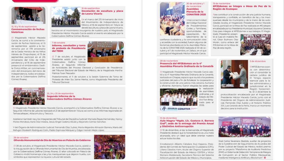 El Magistrado Presidente Héctor Macedo García, acompañó a la Gobernadora Delfina Gómez Álvarez a su Segundo Informe de Labores realizado el 21 de septiembre en Toluca; así como a los informes regionales en Temascaltepec, Atlacomulco y Texcoco.
