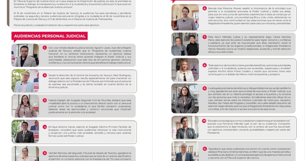 El Tribunal Superior de Justicia inició un nueva etapa en la impartición de justicia; en esta, la prioridad es fortalecer el diálogo, la transparencia y la atención a la ciudadanía y al personal judicial, por lo que puso en marcha el “Programa de Audiencias Justicia cercana”. El 15 de noviembre en el Palacio de Justicia […]